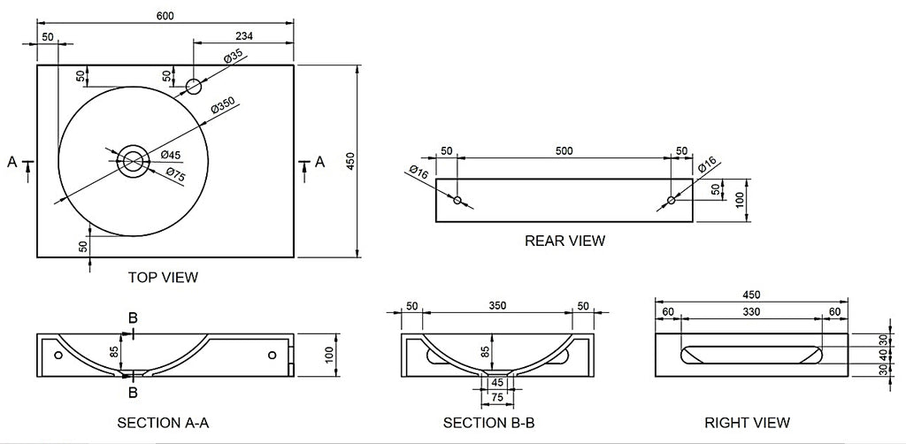 Dimension: 600W x 450D x 100H mm (bowl size 350mm)